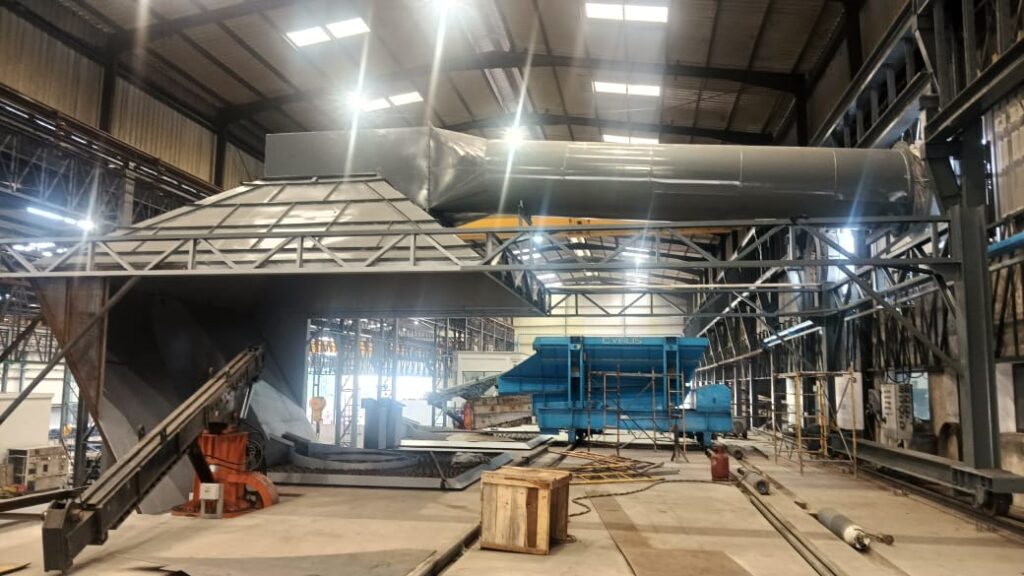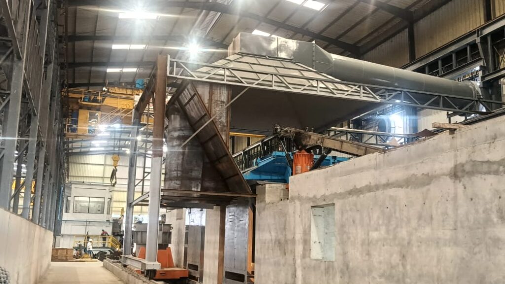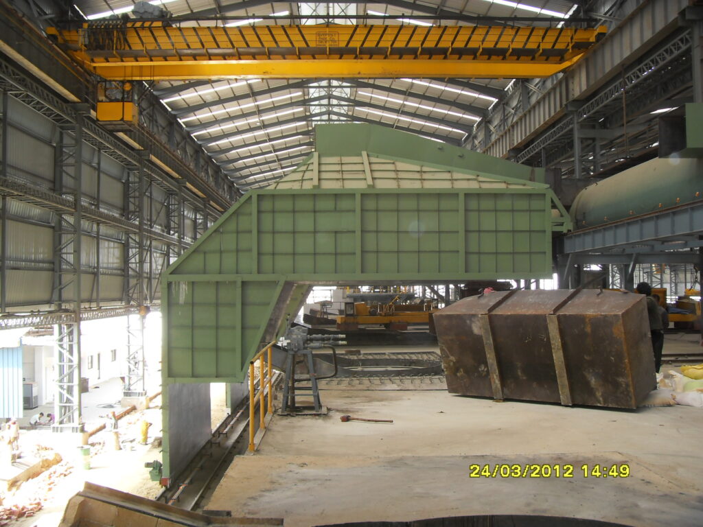 Dog House is a special type of mechanical device consist of steel to capture the Primary & Secondary fumes/smoke/dust. Scrap charging should be through vibro-feeder, trolleys etc. Direct charging through magnet is not possible here. Therefore charging, mixing, molten materials pouring can be done without removing this Dog House type hood. It’s moving though third rail at Pouring side by electro mechanical arrangements.